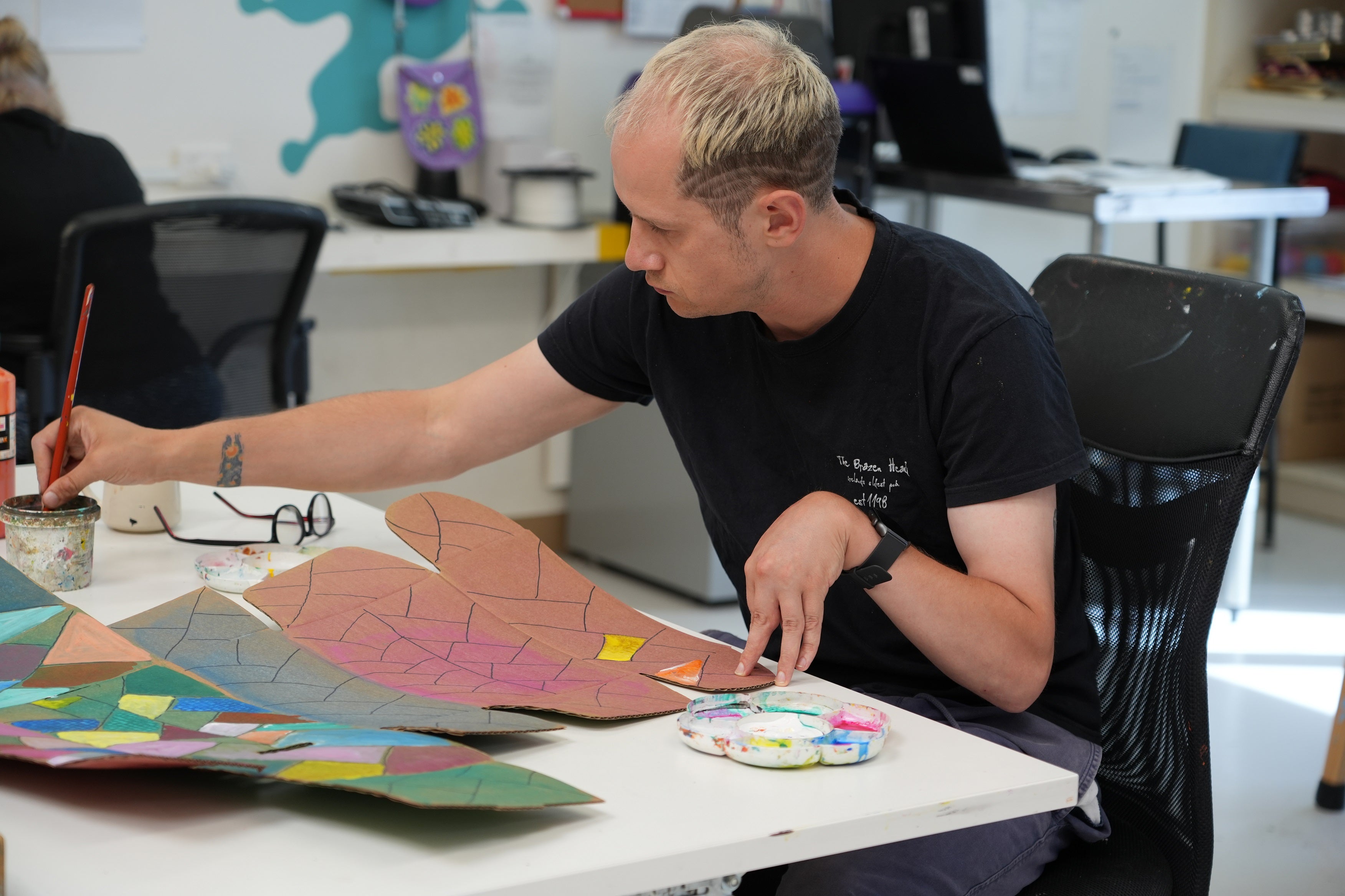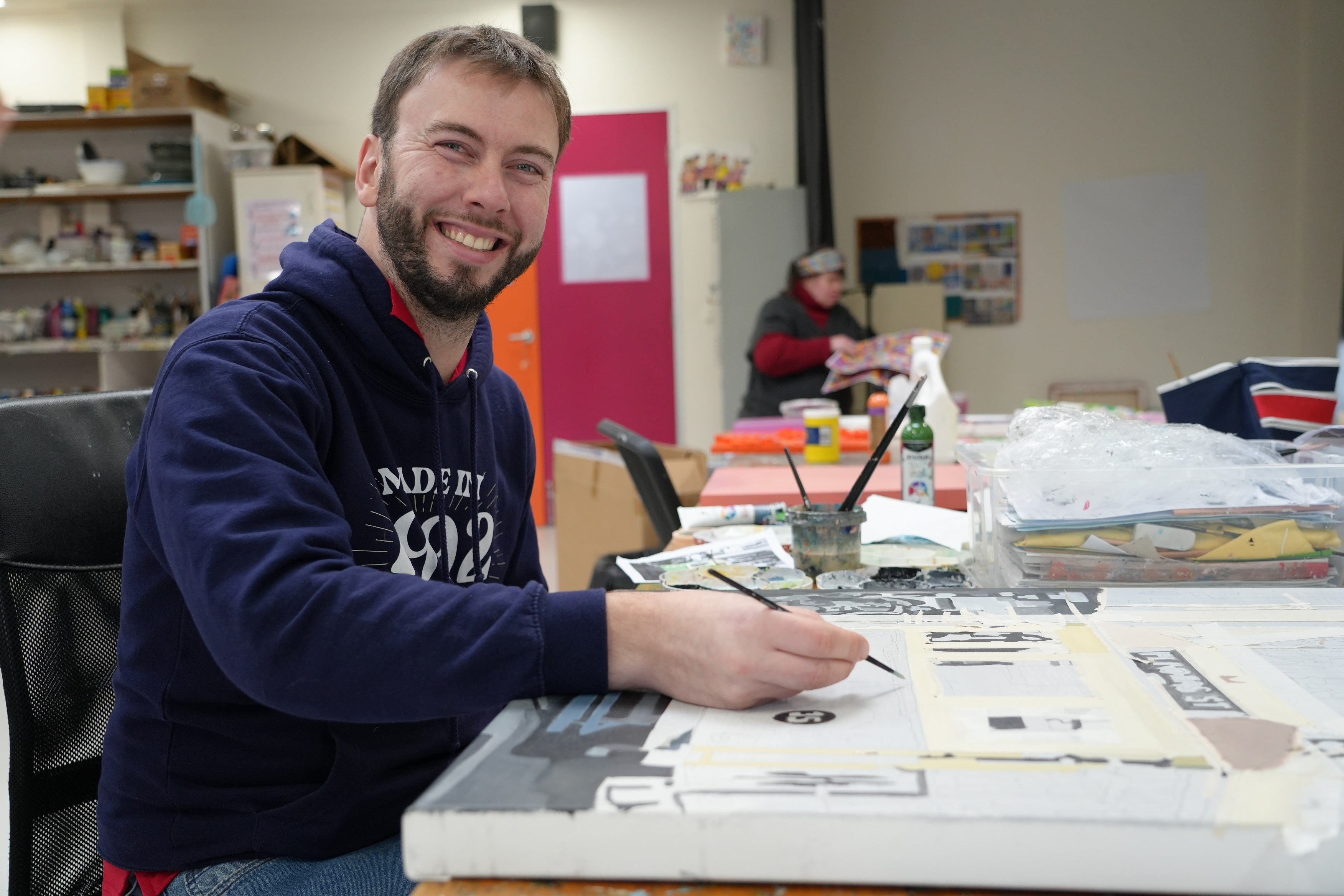 The artist’s work in a collaborative space. Drawing inspiration and education from one another, working primarily in painting. They explore digital work, ceramics, drawing, sewing and jewellery making.