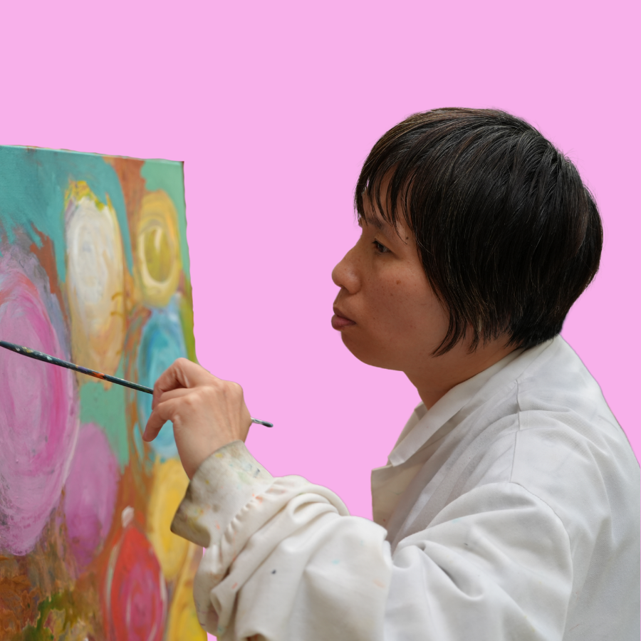 Miranda is a painter whose commitment to repetition and feminine colours has informed her unique artistic style. She depicts repeated shapes of flowers, desserts and fruit which is recognisable by flat and bright colouring enveloped within thick outlines. Miranda’s art portrays everyday objects into colourful delights for the eyes to feast on.