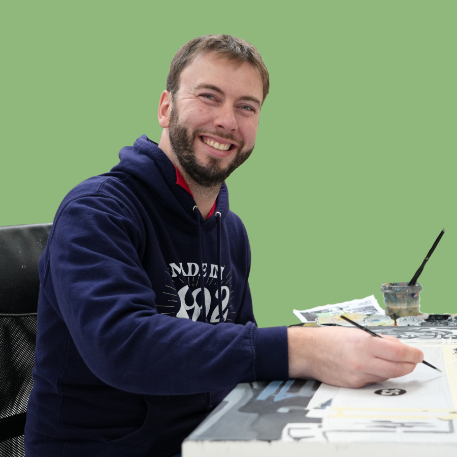 Using different painting techniques, Jordan conveys symbolic meaning through conceptual ideas. He focuses on animals and human form. Jordan explores detailed mark making with portraiture and ceramics and has a new nature inspired colouring book.