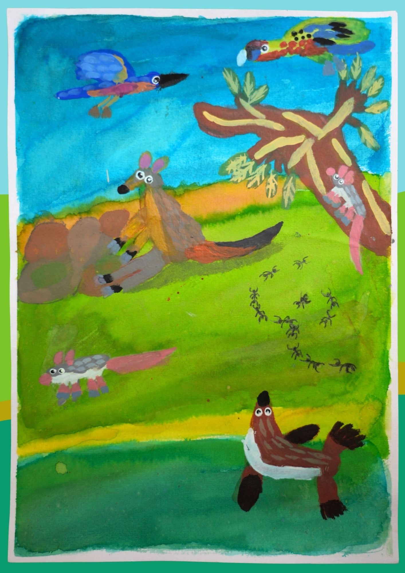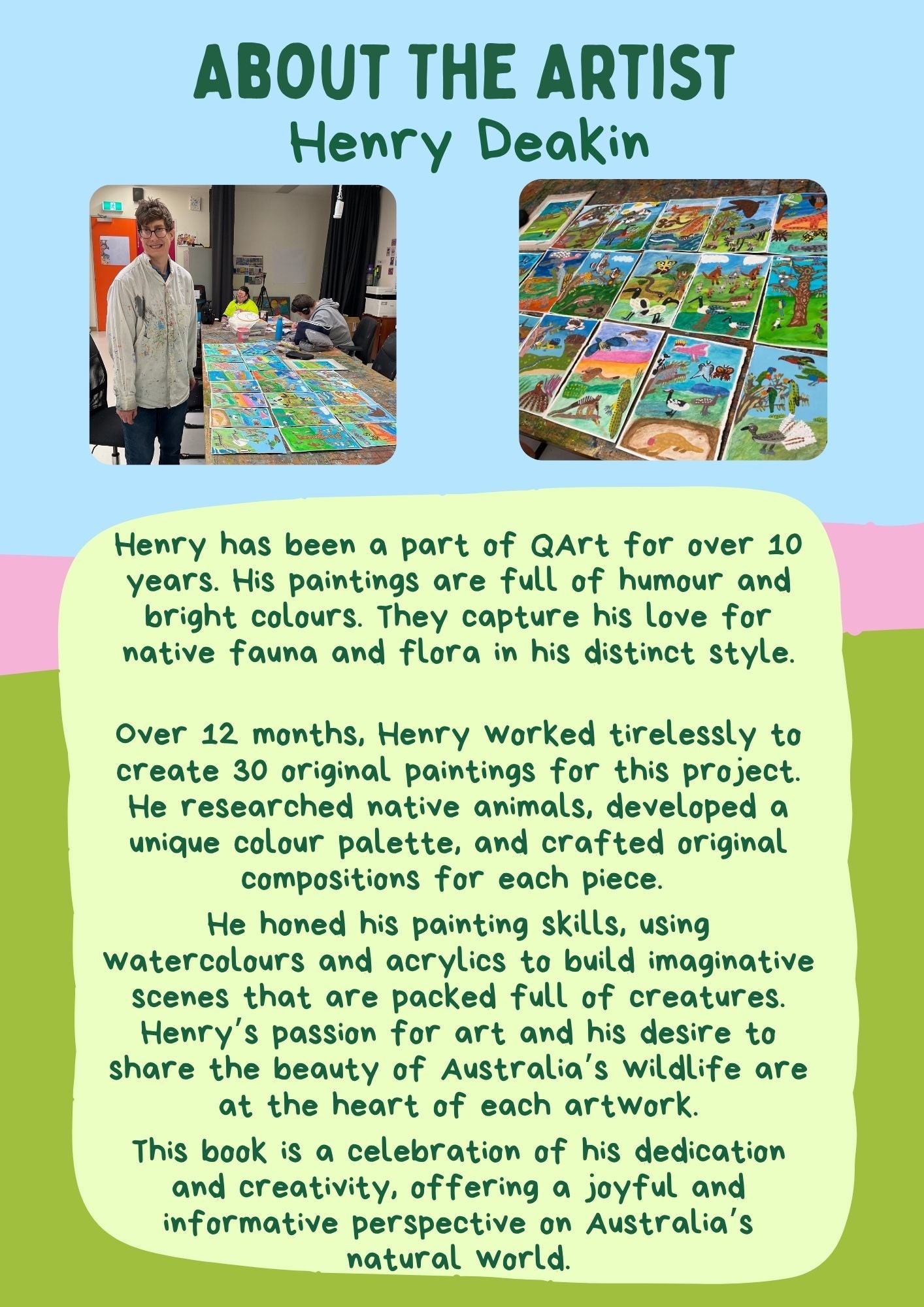 Australian Animals A-Z features vibrant illustrative paintings by Henry Deakin. He uses bright colours, bold outlines, and his signature googly eyes to bring each animal to life in his distinctive style. Enjoy sharing in Henrys passion for Australian animals, birds, and bugs, and learn about some new creatures along the way.