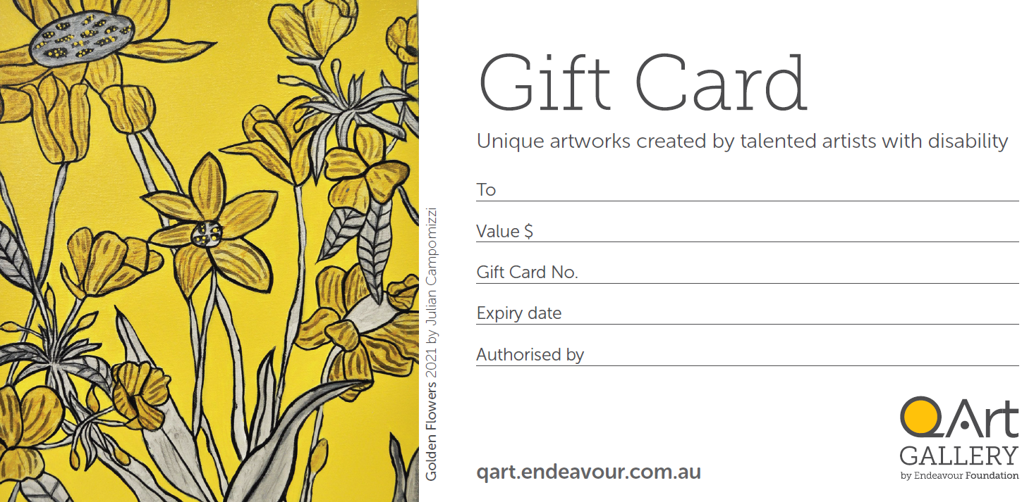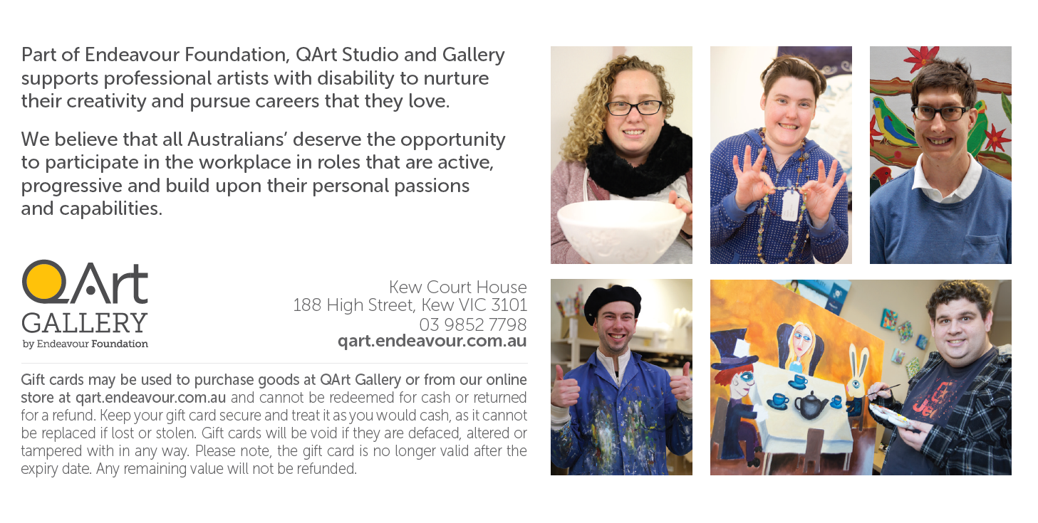 Shopping for someone else, but not sure what give them? Give them the gift that gives twice with a QArt Gallery E-Gift Card. Your purchase will directly support QArt Gallery and Studio, and will also give the lucky recipient the gift of choice, as they'll be able to choose from a range of unique items made by professional artists living with disability.
