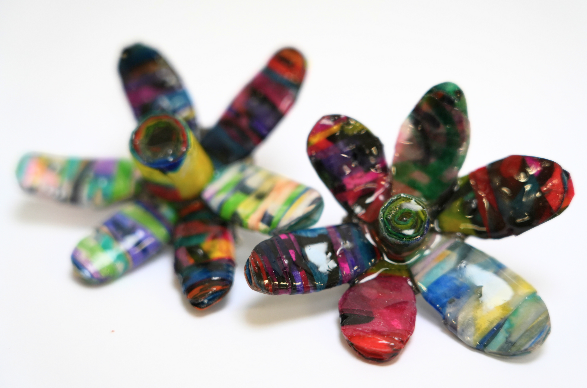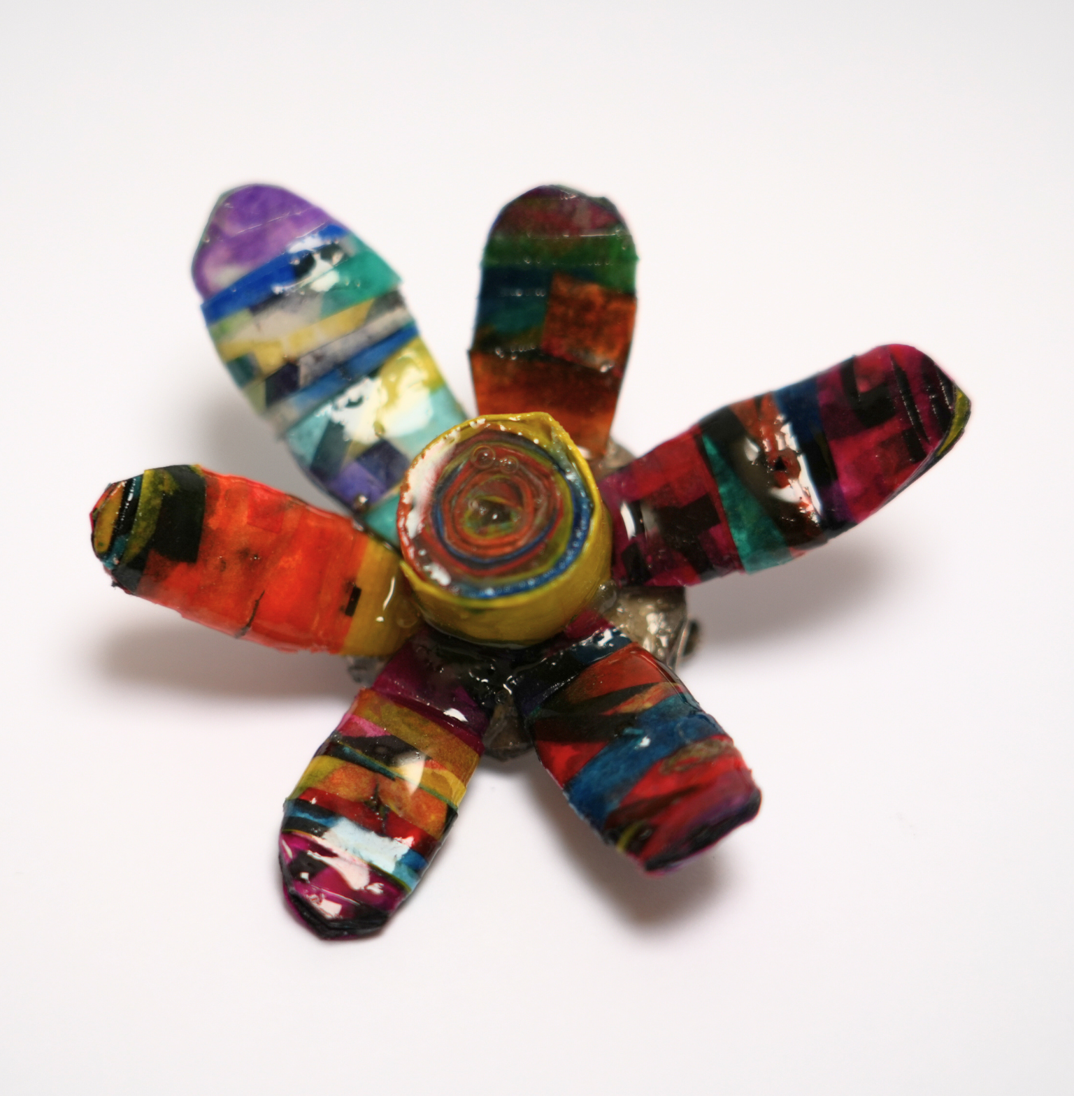 Handmade paper brooch made from recycled artworks by Kitty. Each flower varies slightly and may be different to the product displayed on the website